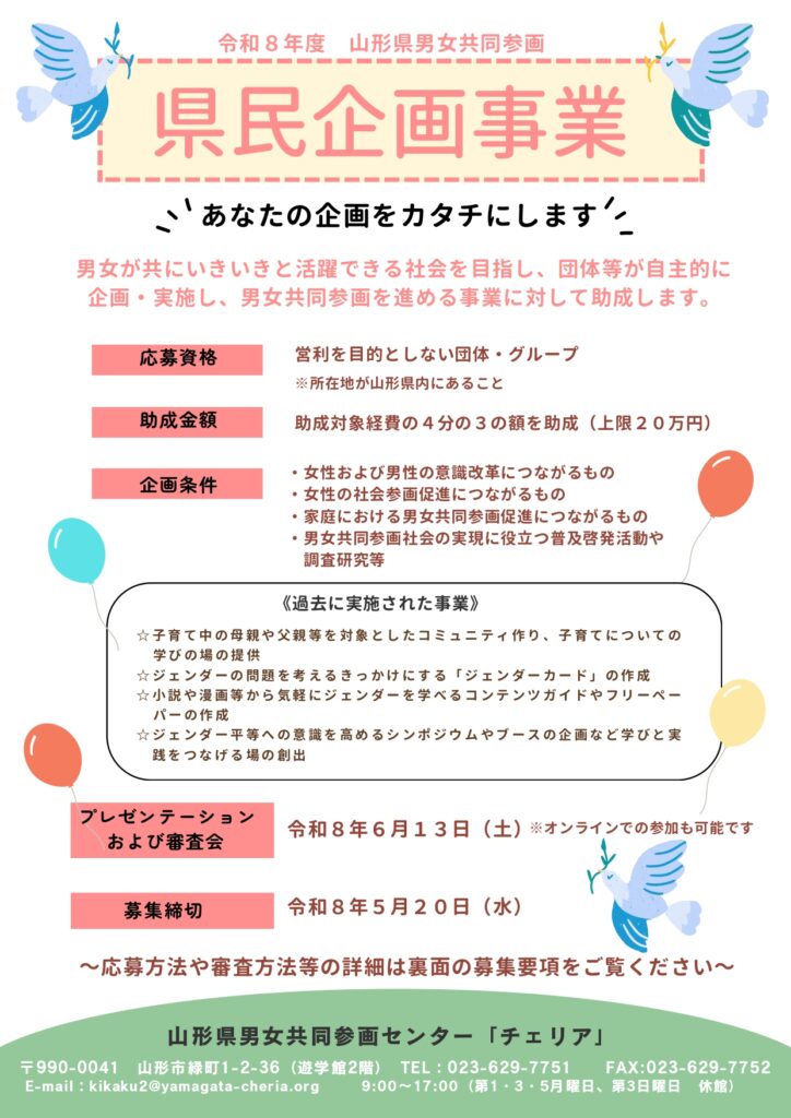 山形県男女共同参画センター「チェリア」では、男女が共にいきいきと活躍できる社会を目指し、団体等が自主的に企画・実施し、男女共同参画を進める事業に対して助成をしています。あなたの団体・グループでも助成金を活用して、男女共同参画を進める事業を企画してみませんか?ただ今申込受付中です!!