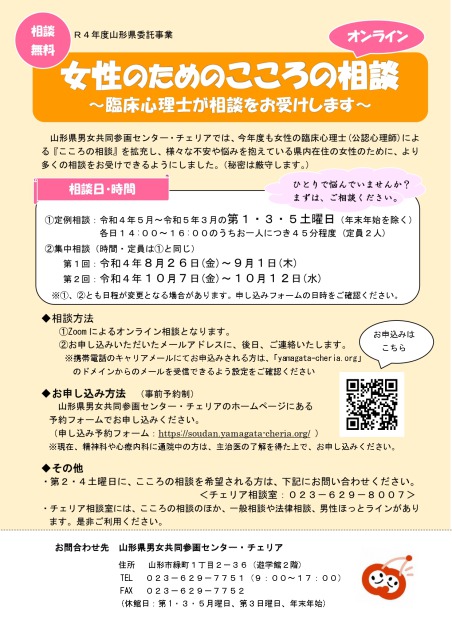 山形県男女共同参画センター・チェリアでは、今年度も女性の臨床心理士(公認心理師)による