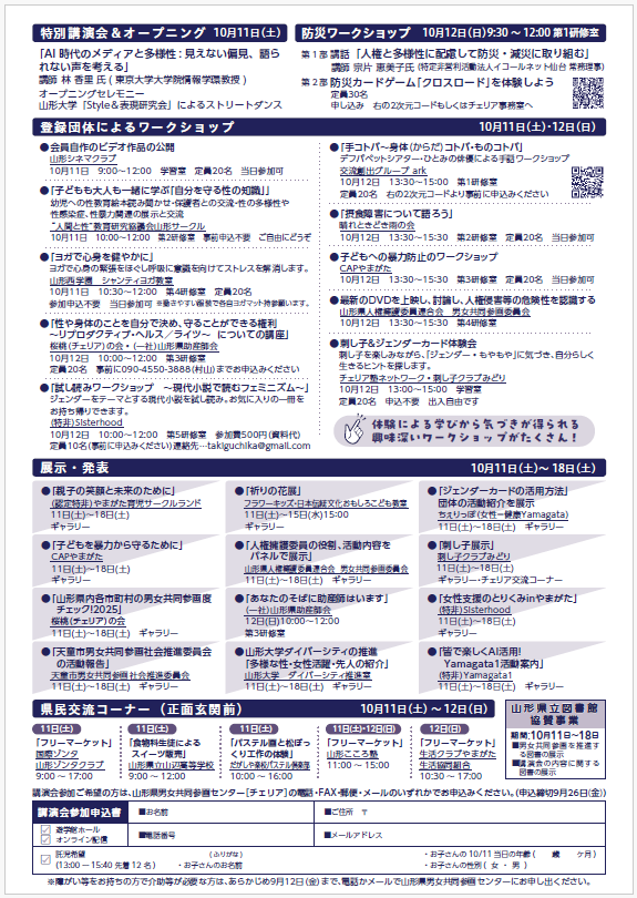 山形県男女共同参画センター「チェリア」にて、事前にご確認、ご予約ください。